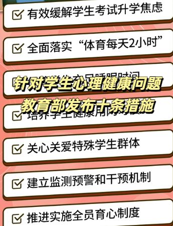 近日,教育部印发通知,出台《进一步加强中小学生心理健康工作十条措施》,针对中小学生心理健康突出问题和阶段性特点,以“小切口”为突破,制定了十条具体措施,全面提升中小学生心理素质,促进身心健康成长。针对学生考试升学焦虑,《十条措施》重申五方面要求:一是强化作业管理,严控总量,严禁机械重复、惩罚性作业,鼓励设立“无作业日”,从源头上减轻日常压力;二是规范考试管理,减少测试频次,合理控制难度,明确禁止按